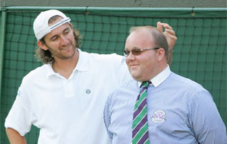 …I say that, the Falstaff of tennis, ’cause comically (black humor yes) Irakli Labadze was the only dude to wander onto Wimbledon grass completely broke, without shorts even, and some nice love handles to boot. Had to convince Londoners to loan him $1500 on spec for the qualifying entry fee, yet ended up on center court playing the 2nd seeded player in the world, and turned that $1500 into $85,000 while having a hell of a good time, as he hurled serves faster than any in the tourney (140 mph?). The longshot Georgian rules, my new favorite tennis player, and well deserves the latest Fanzine sports sonnet.